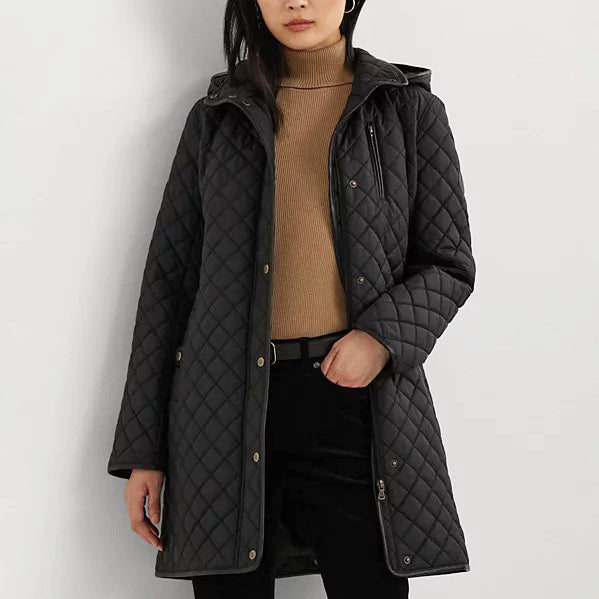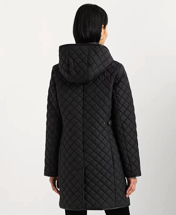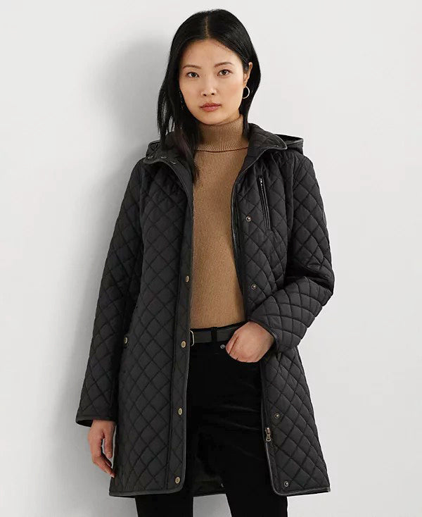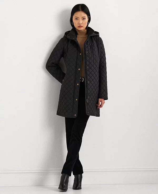 로렌 랄프로렌 블랙 로고 패치 후드 퀼팅 누빔 롱 자켓 코트