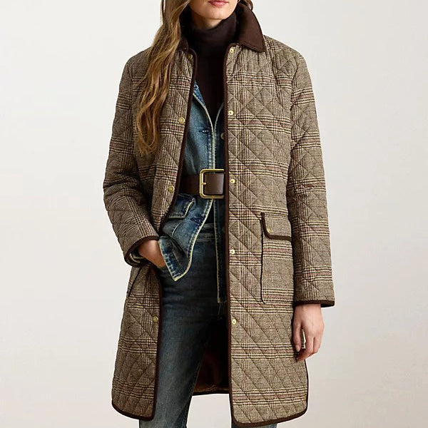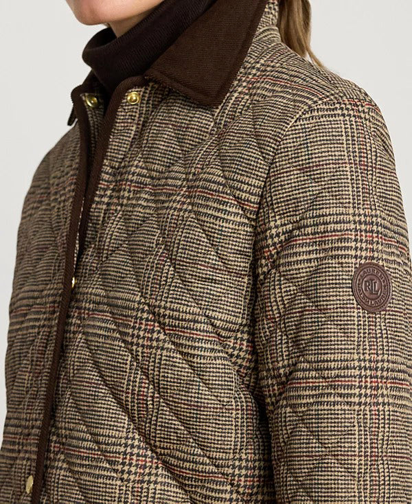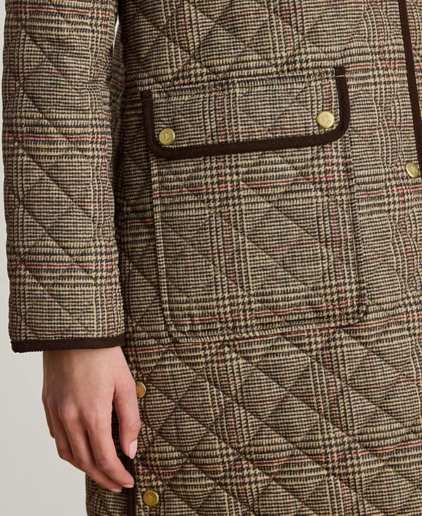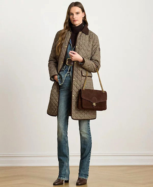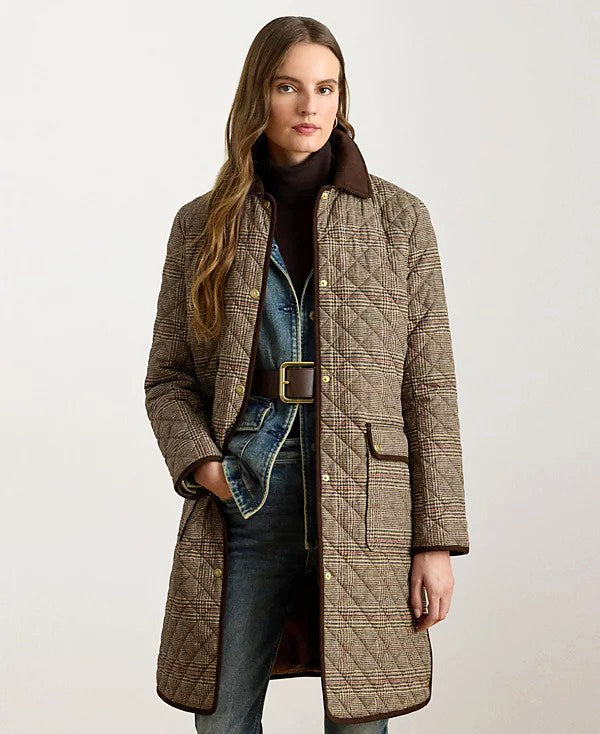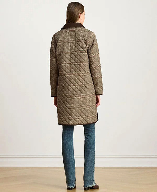 로렌 랄프로렌 브라운 체크 코듀로이 카라 로고 패치 퀼팅 누빔 롱 자켓 코트
