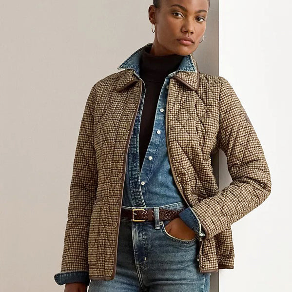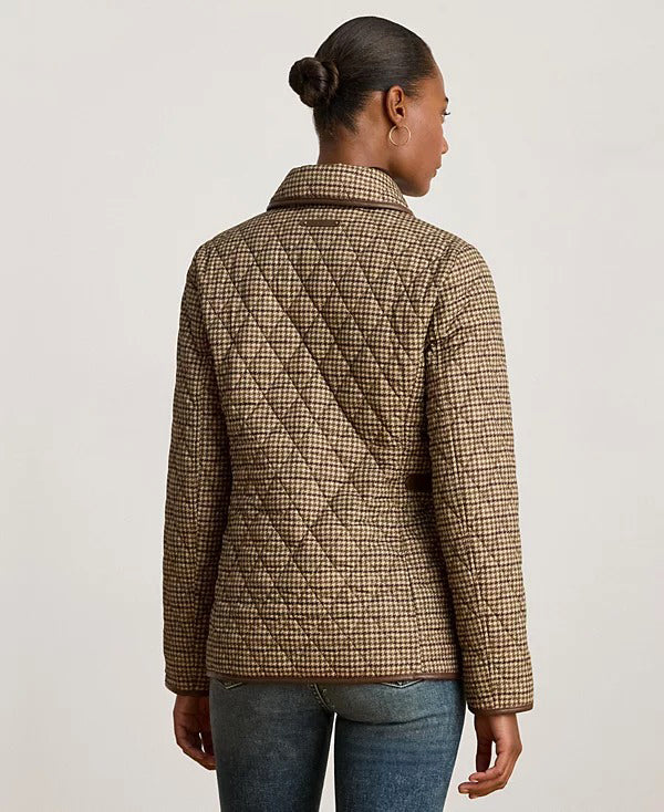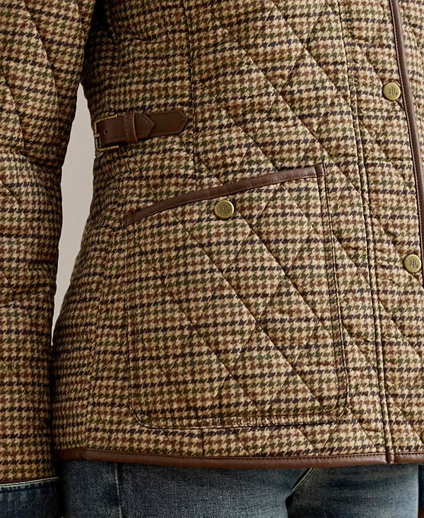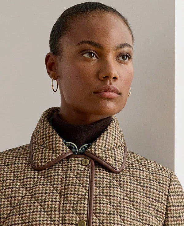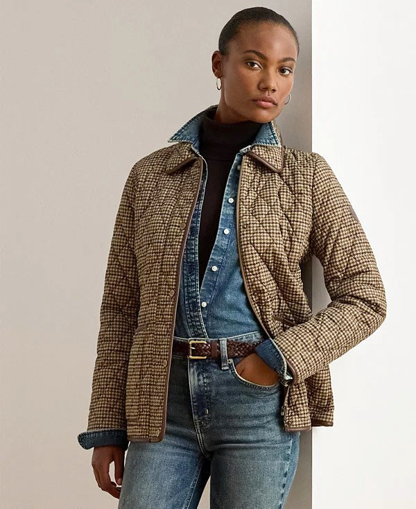 로렌 랄프로렌 브라운 하운드 체크 인조 가죽 트림 카라 퀼팅 누빔 경량 패딩 자켓