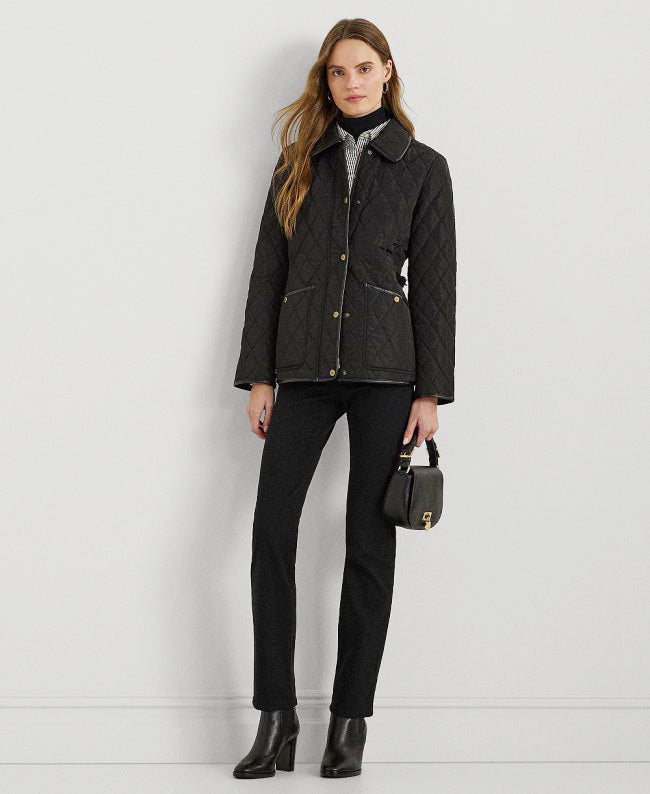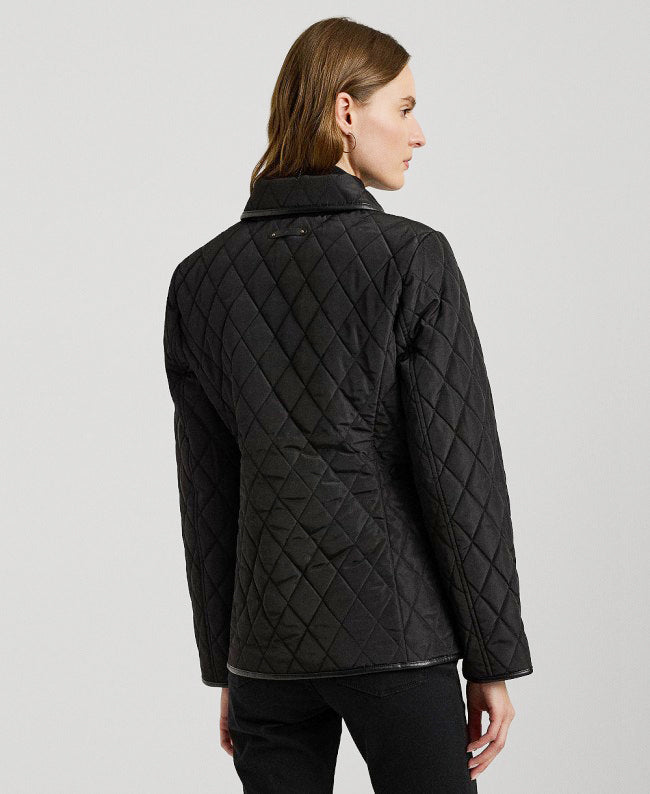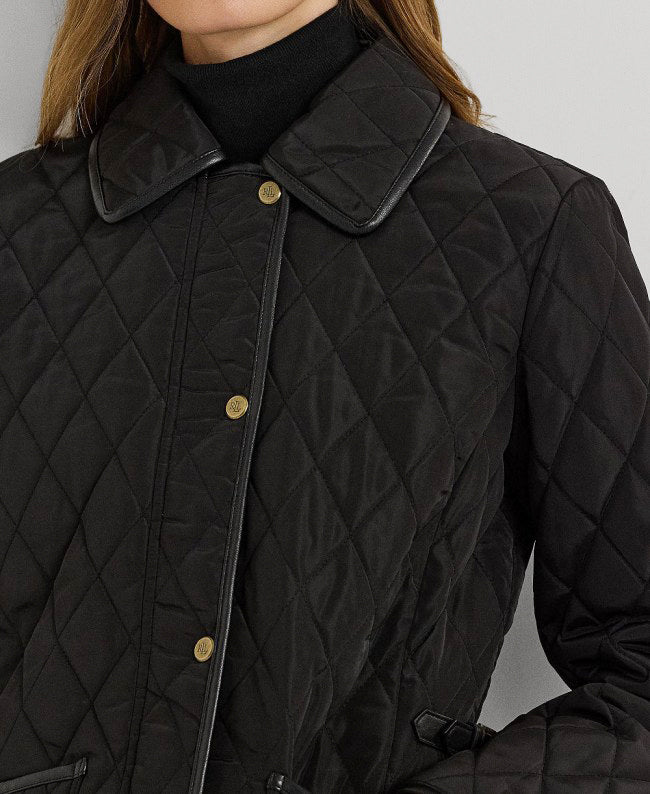 로렌 랄프로렌 블랙 인조 가죽 트림 카라 퀼팅 누빔 경량 패딩 자켓