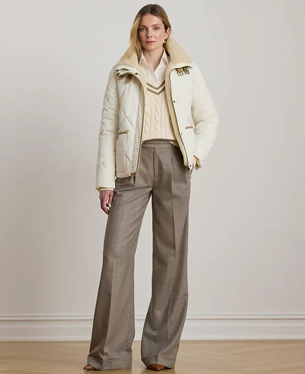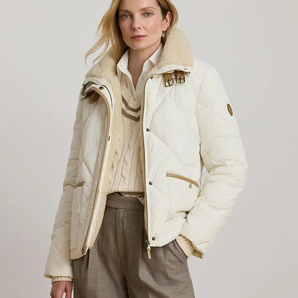 로렌 랄프로렌 크림 인조 양털 쉐르파 버클 포인트 퀼팅 누빔 경량 패딩 숏 자켓 코트