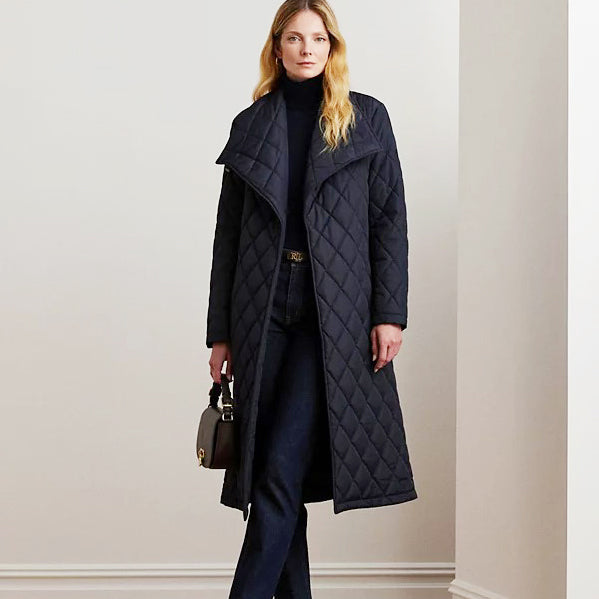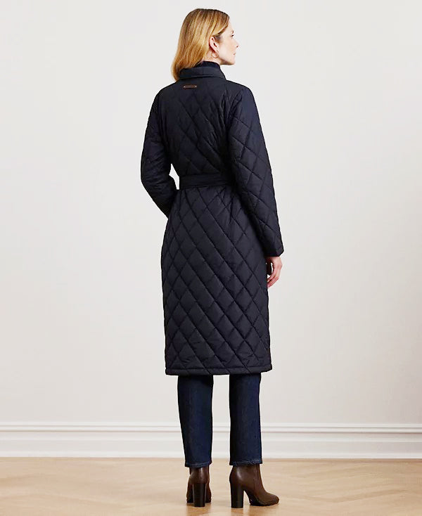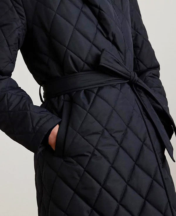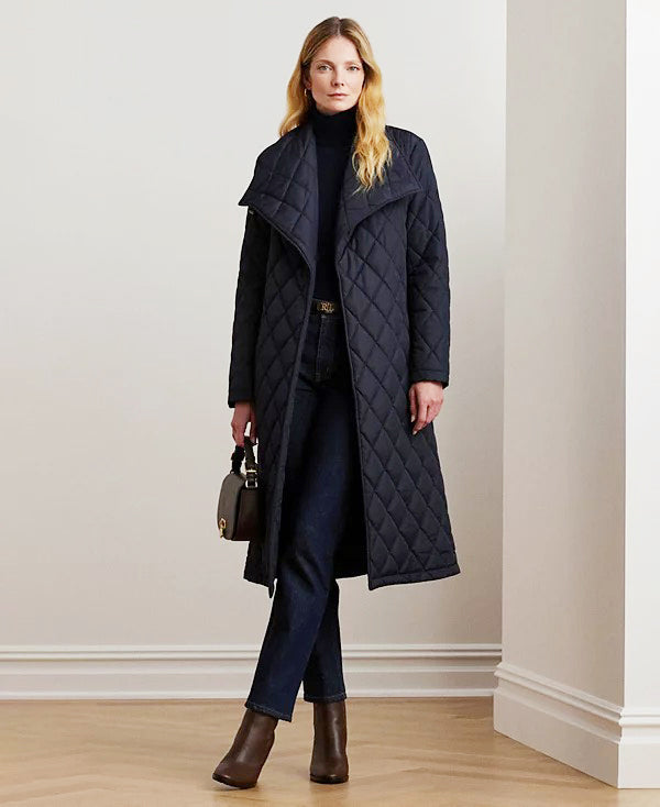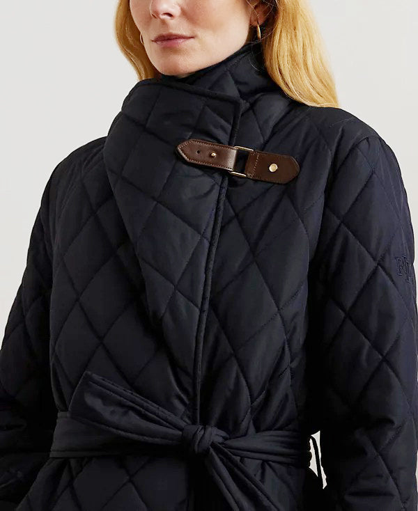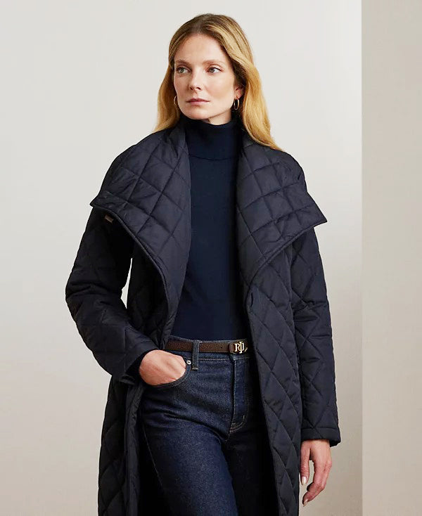 로렌 랄프로렌 다크 네이비 벨트 버클 포인트 빅 카라 벨트 랩 퀼팅 경량 패딩 코트